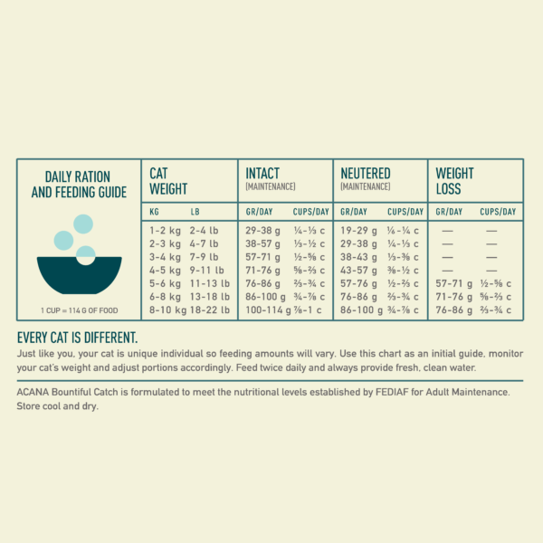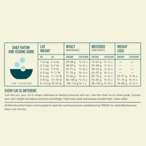 Specially crafted with a bounty of fish, our ACANA™ Bountiful Catch Recipe satisfies your cat with rich fish ingredients. Rich with 65% quality animal ingredients* including raw salmon and whole herring, Bountiful Catch has the animal protein your cat needs to be their best. This nutrient-dense recipe also helps support key health benefits for your cat, including healthy skin & coat, healthy heart & eyes and digestive health. Nurture your feline with a fish-forward recipe tailored to keep them healthy and happy with ACANA Bountiful Catch! *Approximate and derived from the unprocessed state of the ingredients. Our raw ingredients are frozen at their peak freshness.