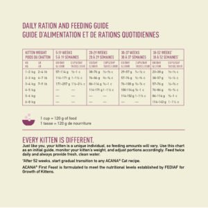 Specially crafted for your kitten, our ACANA™ First Feast Recipe helps support your kitten’s growth and development. Rich with 70% quality animal ingredients* including fresh or raw free-run** chicken and whole herring, First Feast has the animal protein your kitten needs to grow up strong. This nutrient-dense recipe also helps support key health benefits for your kitten, including healthy skin and coat, healthy muscles and bones, and eye and brain development. Nurture your kitten with a recipe tailored to help them grow up healthy and happy with ACANA First Feast! *Approximate and derived from the unprocessed state of the ingredients. **Our free-run chickens and turkeys are not housed in cages and are able to move in a barn without outdoor access. Our fresh ingredients use refrigeration as the sole method of preservation and our raw ingredients are frozen at their peak freshness.