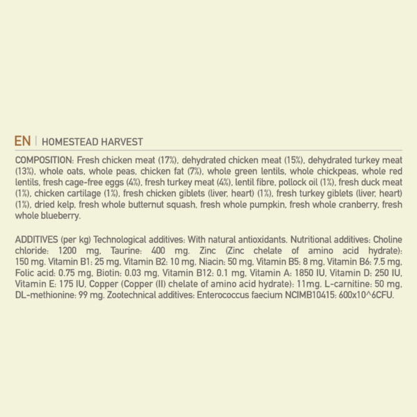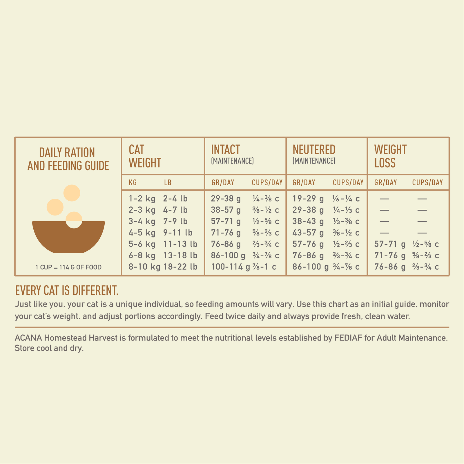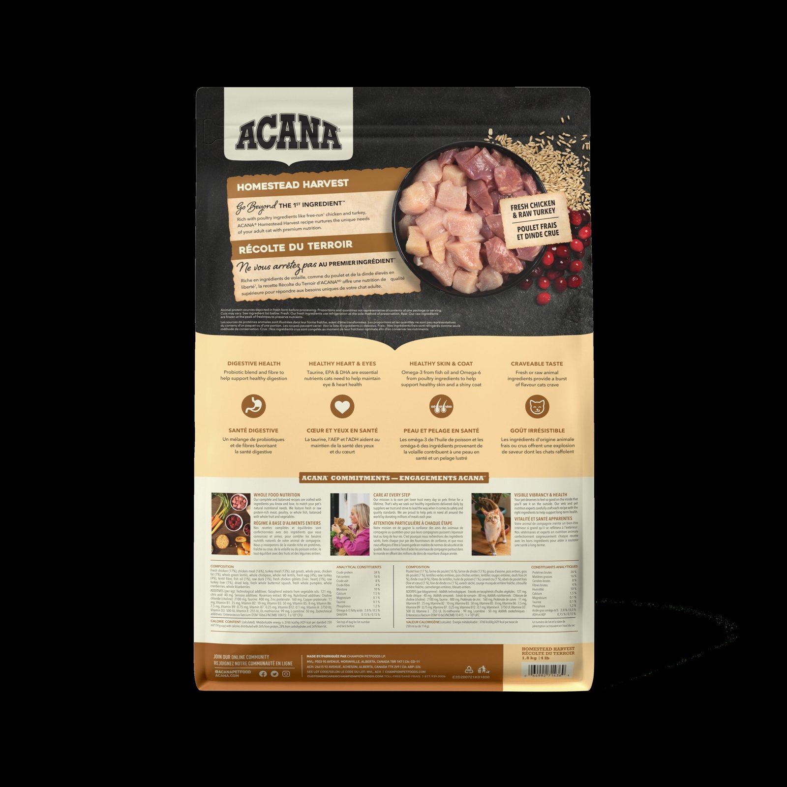 Our ACANAâ„¢ Homestead Harvest Recipe satisfies your cat with plenty of protein-rich poultry. Rich with 65% quality animal ingredients* including free-run** chicken and turkey, Homestead Harvest is crafted with the animal protein your cat needs to be their best. This nutrient-dense recipe also helps support key health benefits for your cat, including shiny coat & healthy skin, strong muscle & bone maintenance, and healthy digestion & immune system. Nurture your feline with a poultry-rich recipe tailored to keep them healthy and happy with ACANA Homestead Harvest! *Approximate and derived from the unprocessed state of the ingredients. **Our free-run chickens and turkeys are not housed in cages and are able to move in a barn without outdoor access. Our raw ingredients are frozen at their peak freshness.