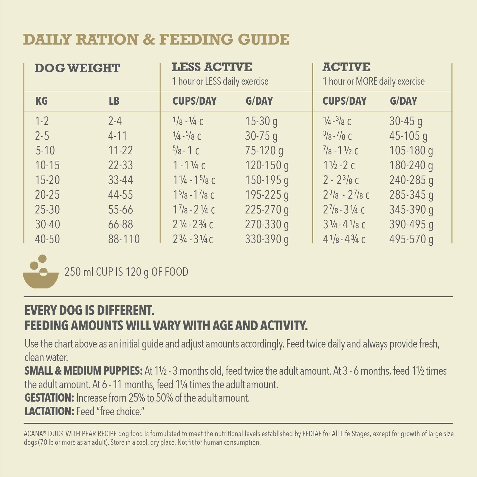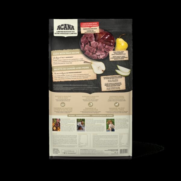 In premium ACANA™ recipes, every ingredient matters. That’s why our ACANA Singles Limited Ingredient Diet Recipes are thoughtfully crafted with protein from a single animal source*, making them perfect for picky pups or dogs with food sensitivities! Our Duck & Pear Recipe includes 60% protein-rich duck ingredients** balanced with 40% vegetables, fruit and nutrients*** like nutritious pears, and no grain ingredients****. It also includes no artificial preservatives, flavours or colours added in our kitchen. This recipe helps support 3 key health benefits for your dog, including healthy skin & coat, healthy digestion and ideal body condition. It helps your dog feel so good on the inside, you’ll see it on the outside! *Also contains fish oil. **Approximate and derived from the unprocessed state of the ingredients. ***We also add vitamins and minerals, natural preservatives, antioxidants and probiotics. ****Produced in a facility that also processes grains.