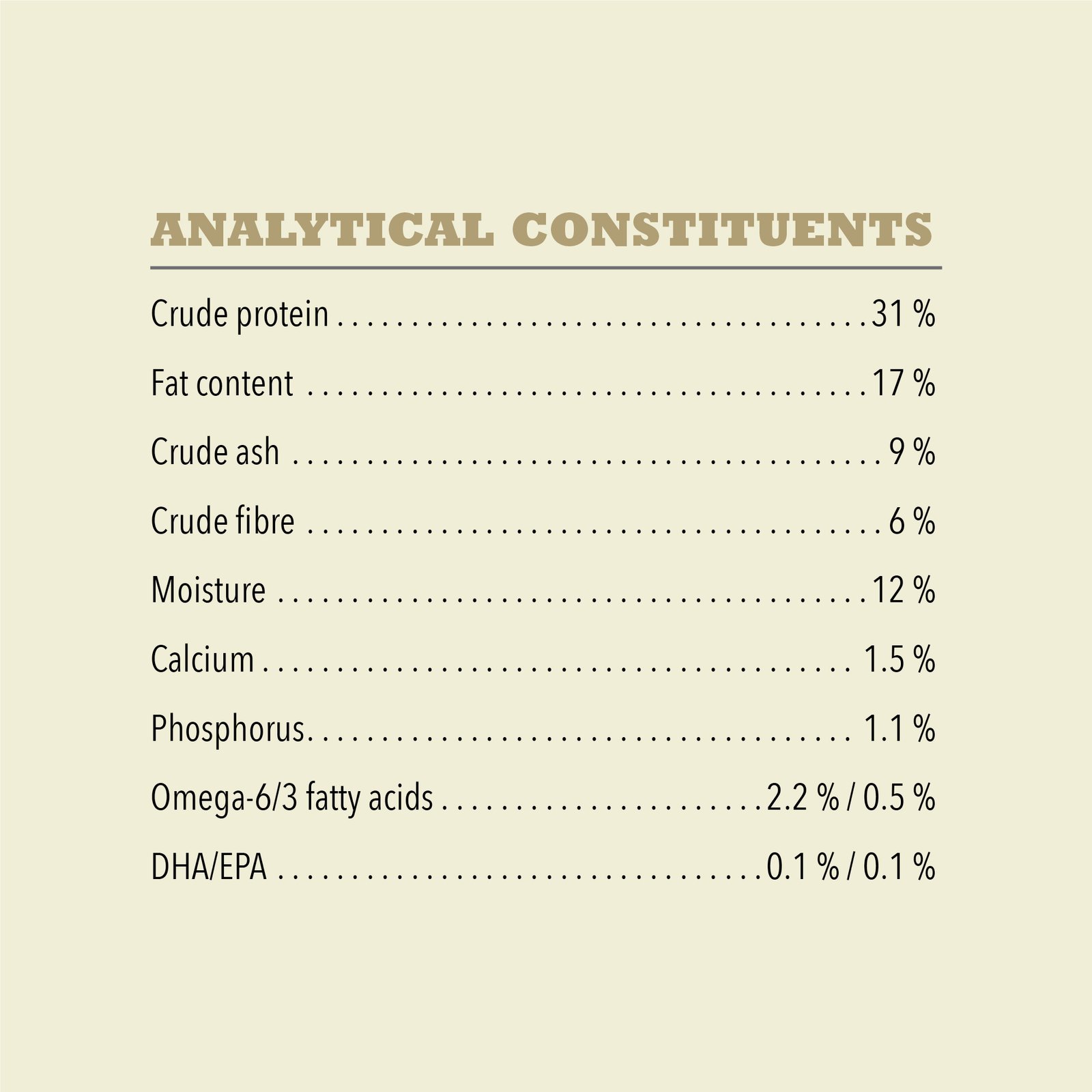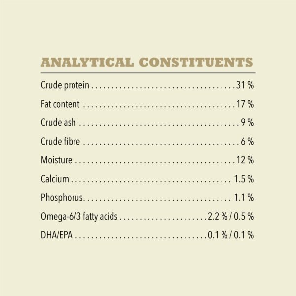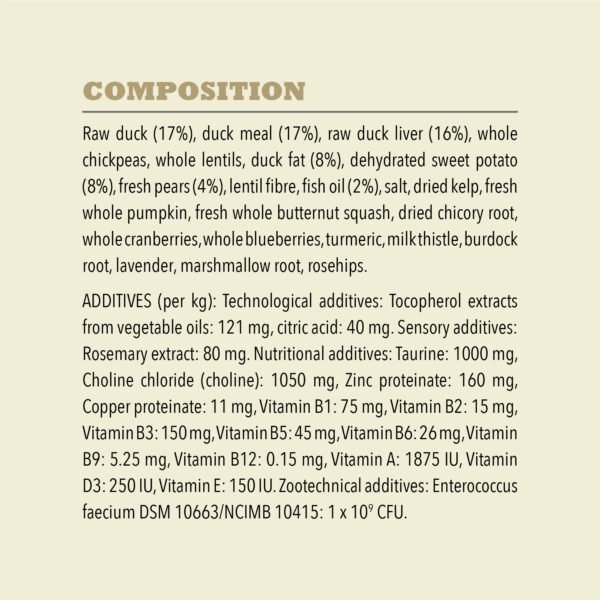 Raw duck (17%), duck meal (17%), raw duck liver (16%), whole chickpeas, whole lentils, duck fat (8%), dehydrated sweet potato (8%), fresh pears (4%), lentil fibre, fish oil (2%), salt, dried kelp, fresh whole pumpkin, fresh whole butternut squash, dried chicory root, whole cranberries, whole blueberries, turmeric, milk thistle, burdock root, lavender, marshmallow root, rosehips, ADDITIVES (per kg): Technological additives: Tocopherol extracts from vegetable oils: 121mg, citric acid: 40mg. Sensory additives: Rosemary extract: 80 mg Nutritional additives: Taurine: 1000 mg, Choline chloride (choline): 1050 mg, Zinc proteinate: 160 mg, Copper proteinate: 11 mg, Vitamin B1: 75 mg, Vitamin B2: 15 mg, Vitamin B3: 150 mg, Vitamin B5: 45 mg, Vitamin B6: 26 mg, Vitamin B9: 5.25 mg, Vitamin B12: 0.15 mg, Vitamin A: 1875 IU, Vitamin D3: 250 IU, Vitamin E: 150 IU. Zootechnical additives: Enterococcus faecium DSM 10663/NCIMB 10415: 1 x 109 CFU. Crude protein 31% Fat content 17% Crude ash 9% Crude fibre 6% Moisture 12% Calcium 1.5% Phosphorus 1.1% Omega-6 fatty acids* 2.2% Omega-3 fatty acids* 0.5% DHA (docosahexaenoic acid) 0.1% EPA (eicosapentaenoic acid) 0.1%