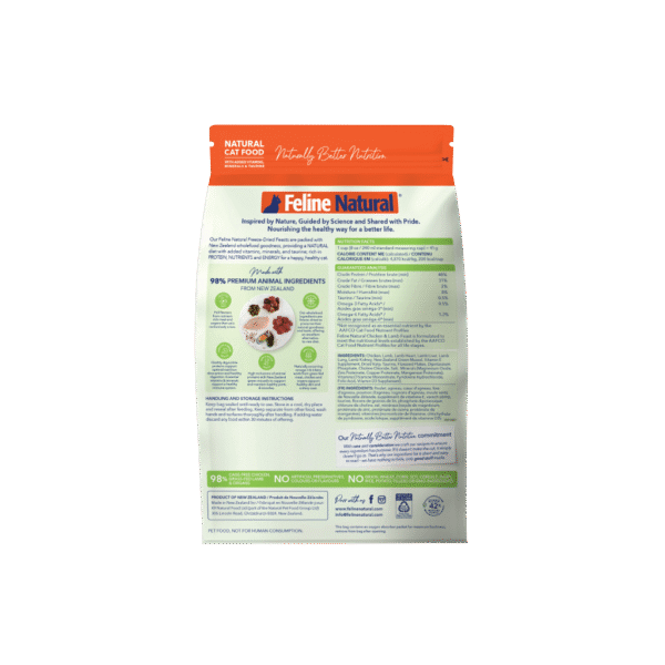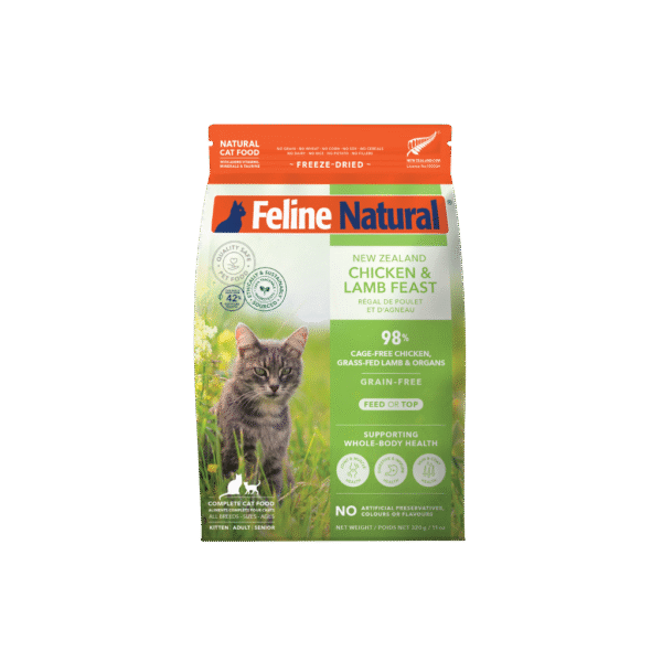 Feline Natural Chicken and Lamb Feast Freeze-Dried Cat Food is a complete and balanced meal formulated for all life stages. It can be fed as it is, or as a nutrient-dense meal topper over regular kibble. This formula is freeze-dried to lock in flavour, aroma, and nutritional value. Made in New Zealand and without wheat, gluten, GMO ingredients, corn, soy, cereals, dairy, rice, potato, and all other fillers.