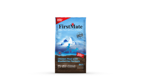 FirstMate Limited Ingredient Chicken Meal with Blueberries Formula for Dogs – Small BitesĀ is made in a family-owned facility in Chilliwack, British Columbia and is ideal for dogs of all breeds and life stages. The kibble is smaller than traditional kibbles to make it easier for smaller dogs or dogs with more sensitive mouths to eat.