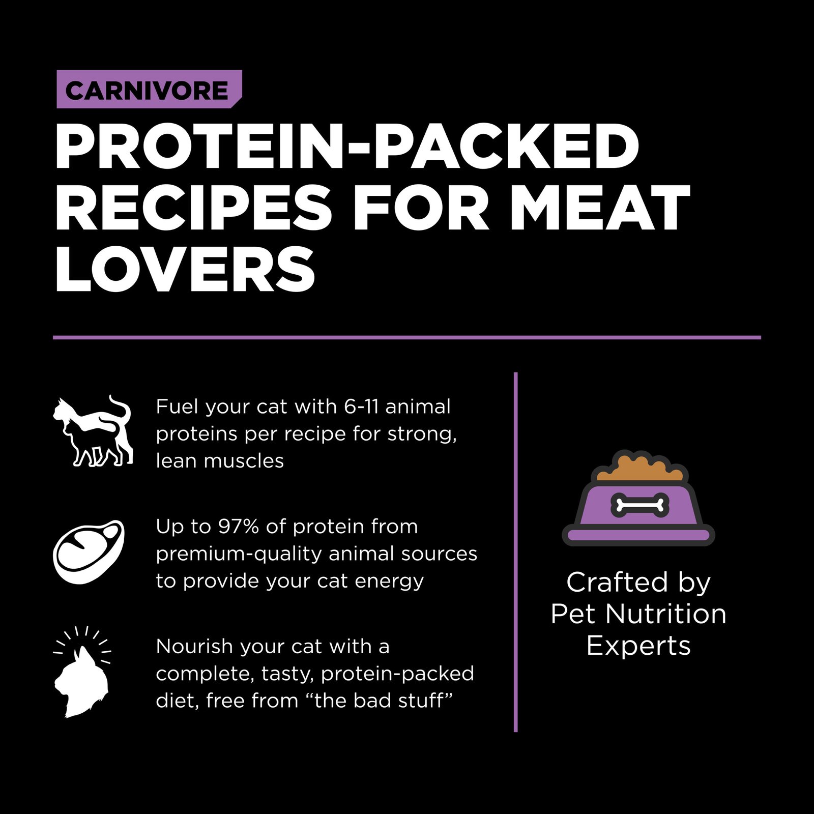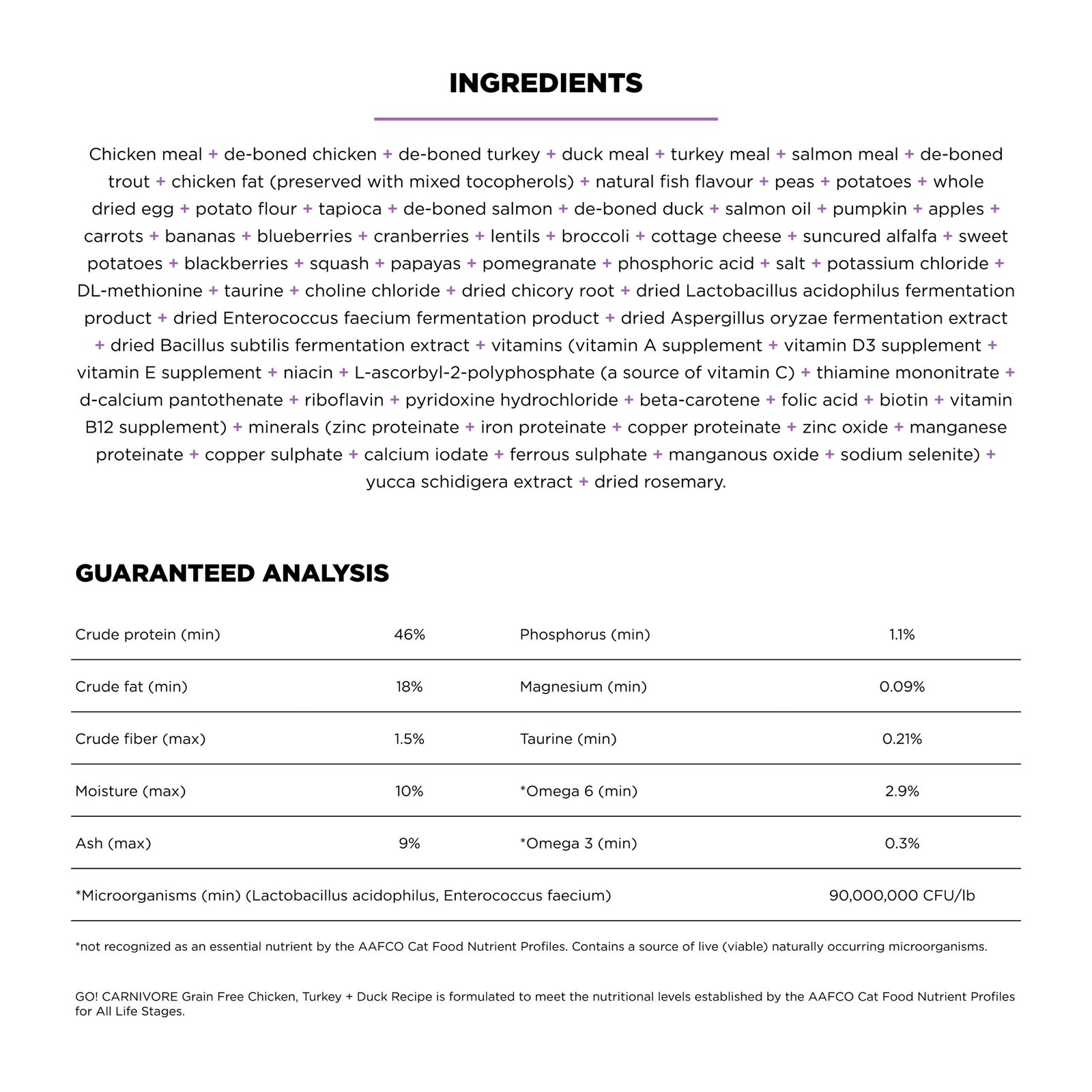 Go! Solutions Carnivore Chicken Turkey + Duck Grain Free Recipe for cats is a great solution for supporting your feline friend’s strong, lean muscles. Made with real premium-quality meat and fish, and crafted by pet nutrition experts in Ontario, Canada, this recipe is sure to have your cat purring with delight.