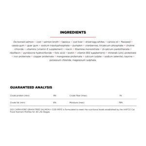 De-boned salmon, cod, salmon broth, tapioca, cod liver, dried egg whites, canola oil, flaxseed, cassia gum, guar gum, sodium tripolyphosphate, pumpkin, cranberries, tricalcium phosphate, choline chloride, vitamins (vitamin E supplement, niacin, thiamine mononitrate, d-calcium pantothenate, riboflavin, pyridoxine hydrochloride, folic acid, biotin, vitamin B12 supplement), minerals (zinc proteinate, iron proteinate, copper proteinate, manganese proteinate, calcium iodate, sodium selenite), taurine, potassium chloride, magnesium sulphate. Crude protein (min) 9% Crude fat (min) 6% Crude fibre (max) 1% Moisture (max) 78%