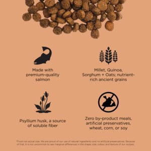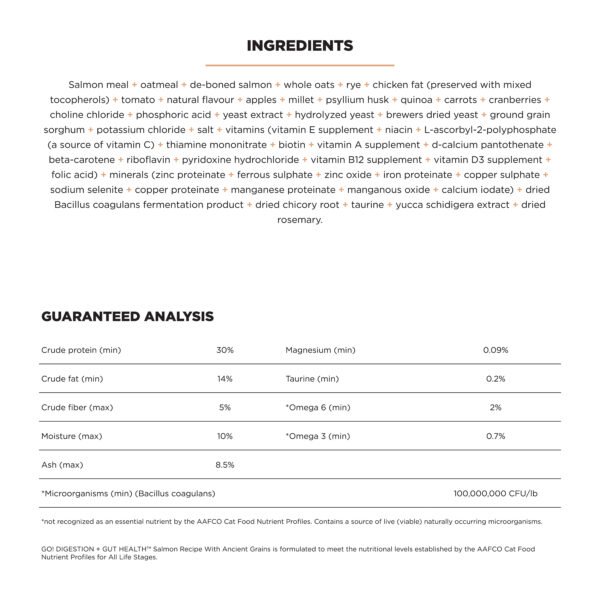 Looking for a way to keep your cat’s gut happy and healthy? Look no further than Go! Solutions Digestion + Gut Health Salmon Recipe with Ancient Grains for cats. Made in Ontario, Canada with premium-quality ingredients, this recipe features a blend of fibre-rich ancient grains, prebiotics, and probiotics to help support good digestion, a healthy gut, and the overall wellbeing of your cat.