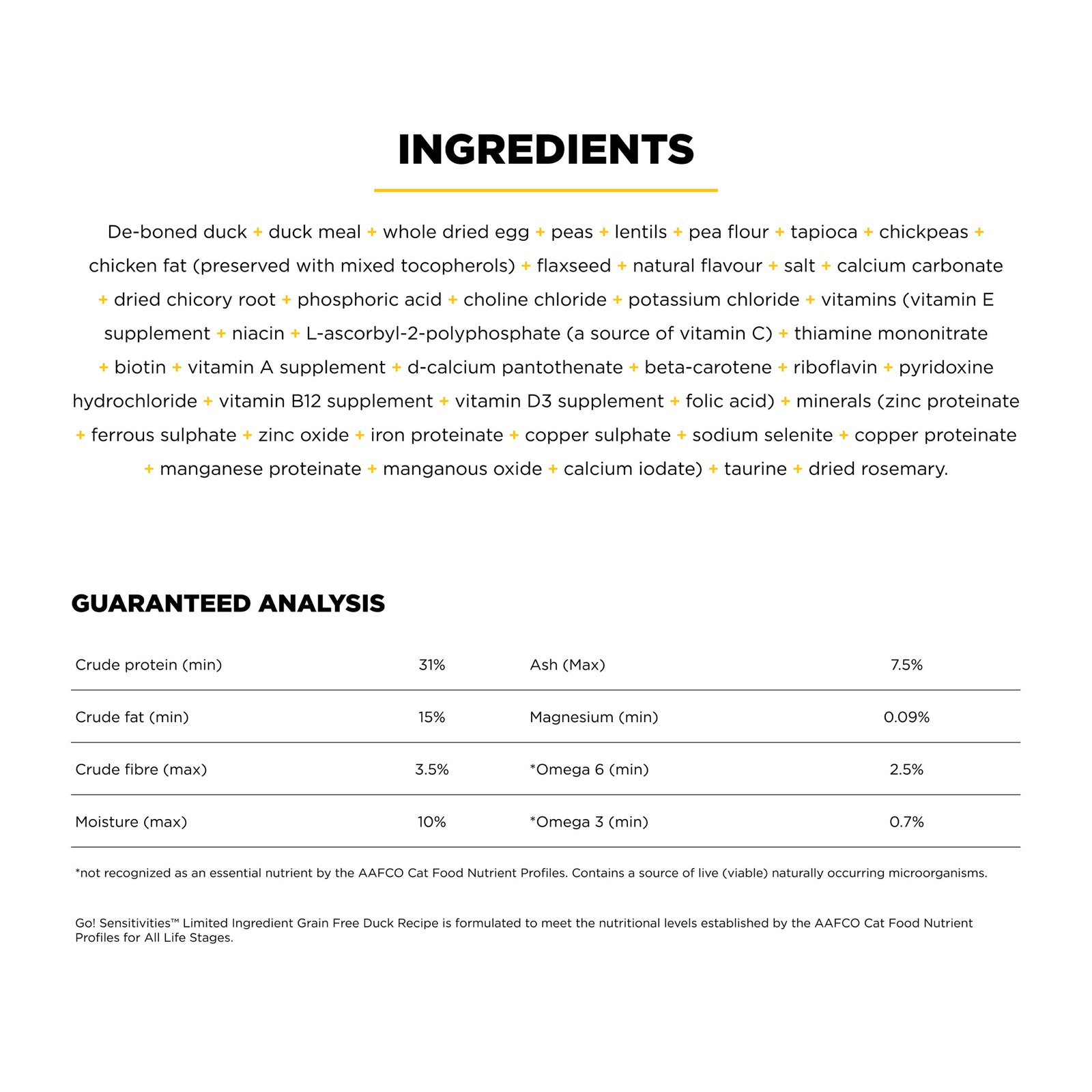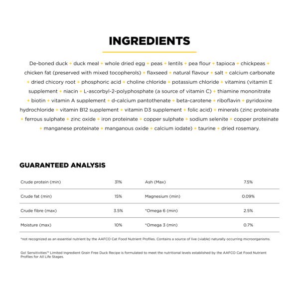 Go! Solutions Sensitivities Limited Ingredient Grain Free Duck Recipe for Cats is a great solution for our feline friends with food allergies and sensitivities! Made in Ontario, Canada with premium quality ingredients including single-source de-boned duck, this delicious recipe is formulated with as few additional ingredients as possible for a meal that is gentle on sensitive stomachs.