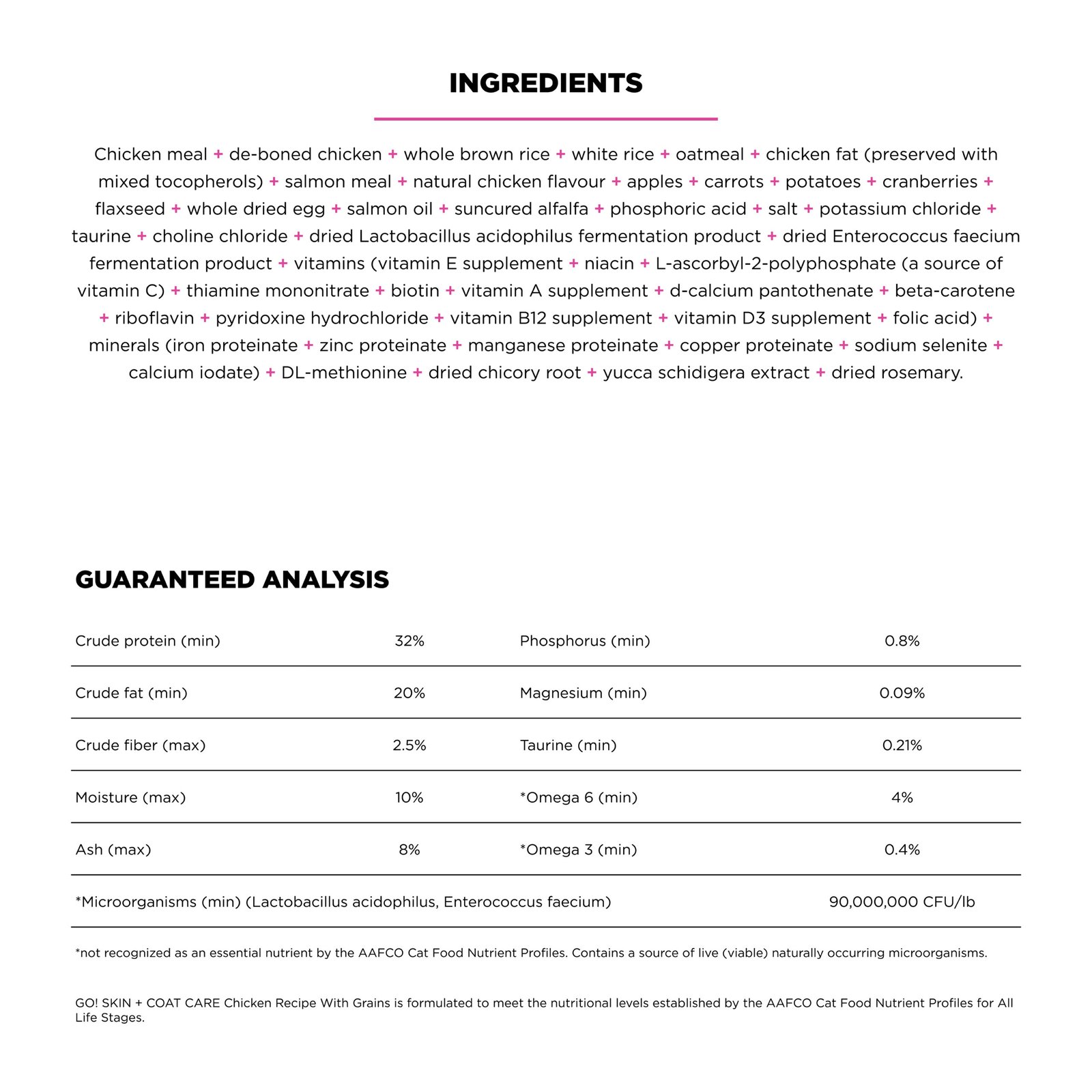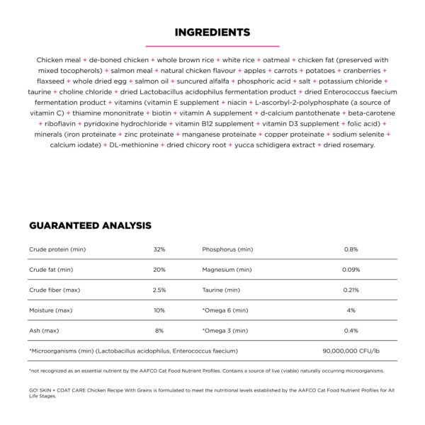 Go! Solutions Skin + Coat Care Chicken Recipe with Grains for cats is made with love in Ontario, Canada. This premium cat food is packed with omega fatty acids to keep your cat’s skin hydrated and their coat looking fabulous. Made with natural ingredients like premium-quality chicken, antioxidant-rich fruits + veggies, and whole grains for an energy boost, this complete & balanced recipe is free from by-product meals, artificial preservatives, flavours or colours, and wheat, corn, or soy.