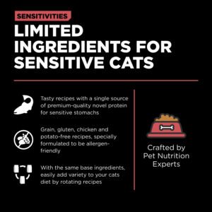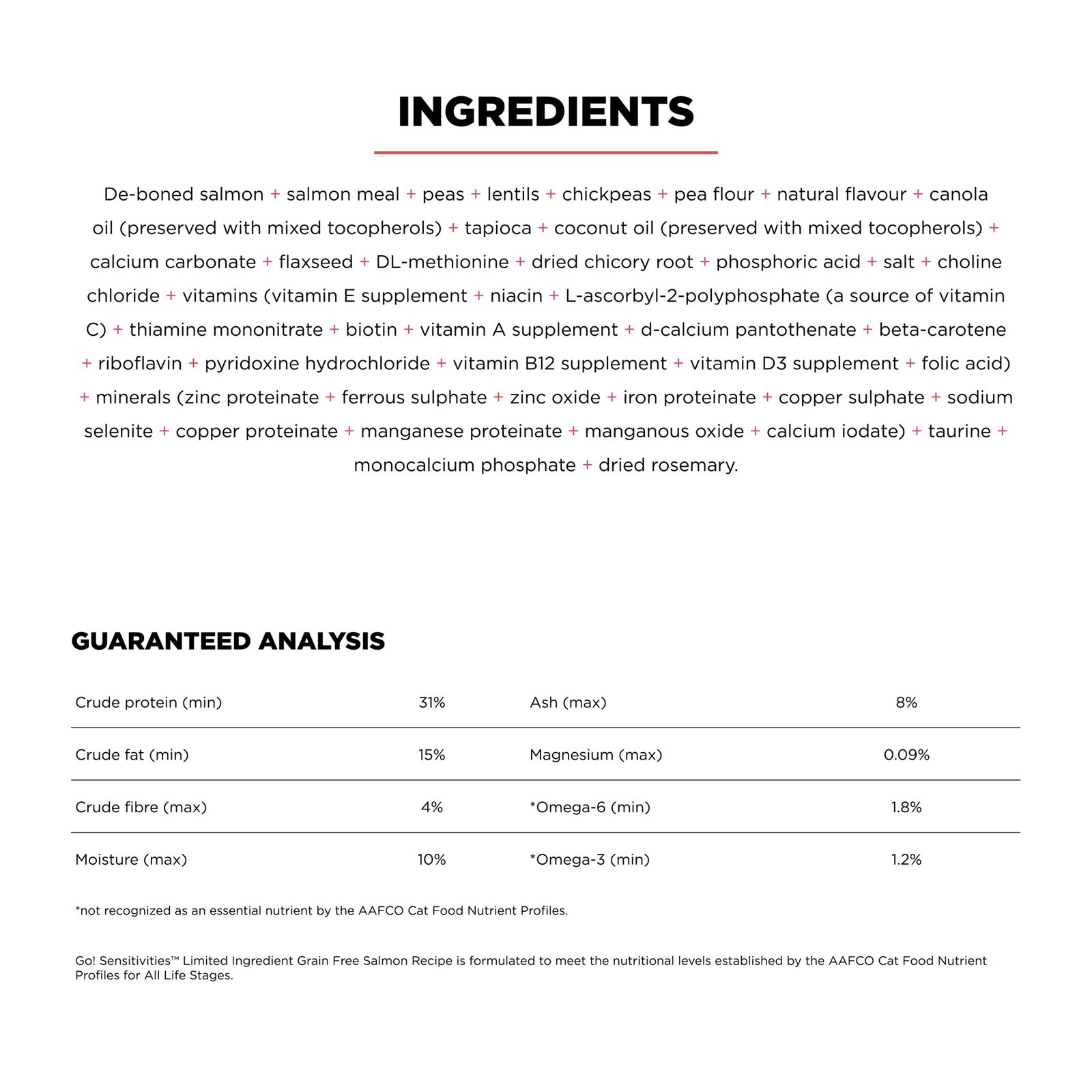 Looking for a cat food that supports food allergies and also tastes great? Go! Solutions Sensitivities Limited Ingredient Grain Free Salmon recipe for cats is formulated for health benefits and flavour, with premium quality salmon as the single-source animal protein. Using as few additional ingredients as possible, this recipe is free from common food allergens, making it a great option for sensitive cats. Made by pet nutrition experts in Ontario, Canada with only premium ingredients, you will love the quality and your cat will love the taste.