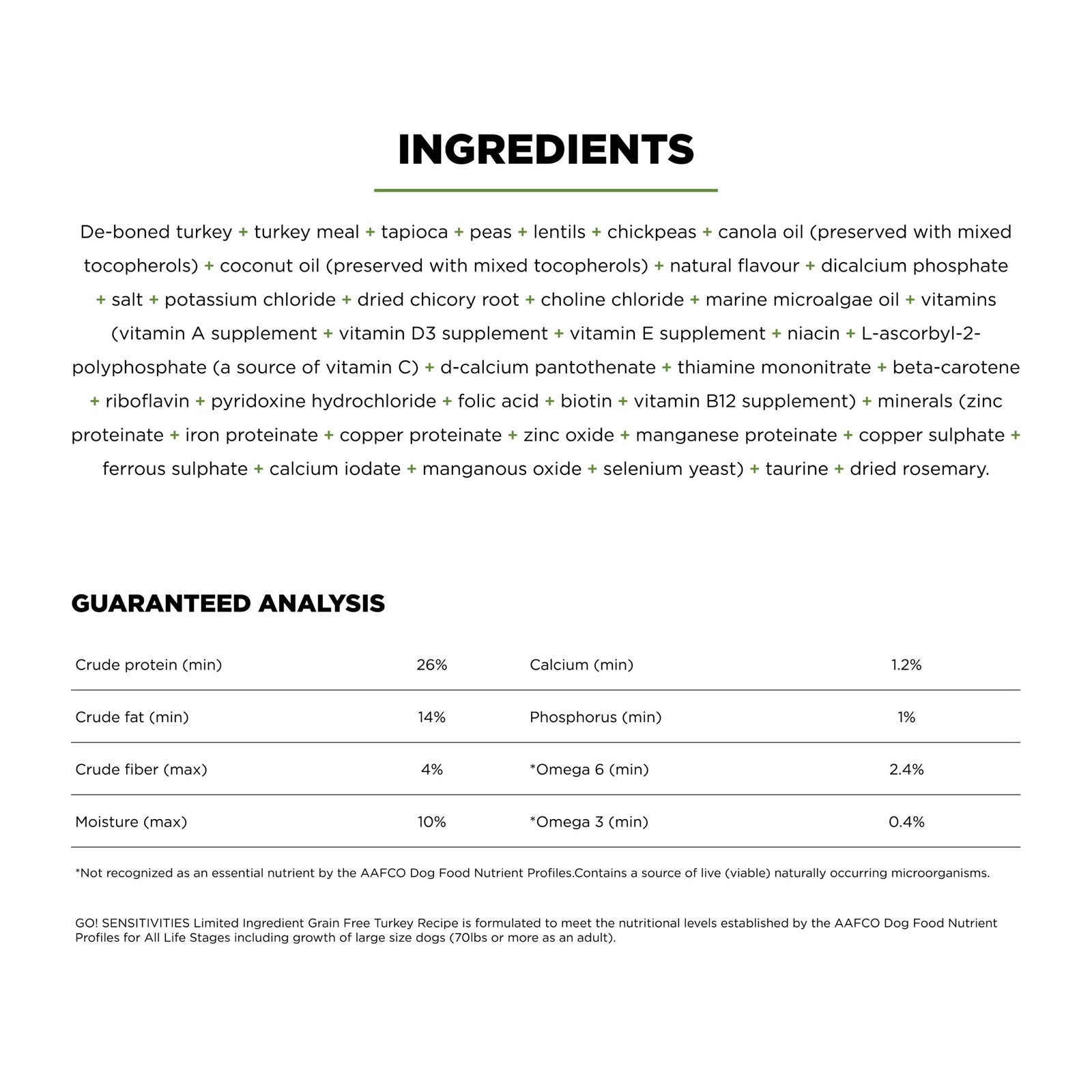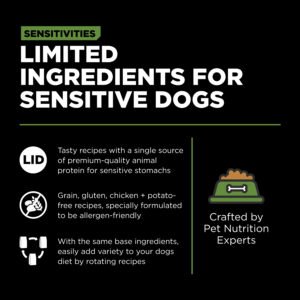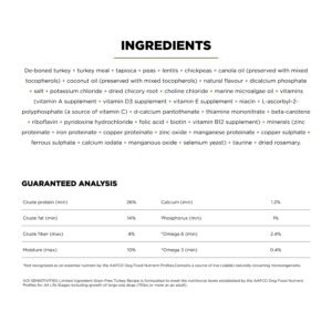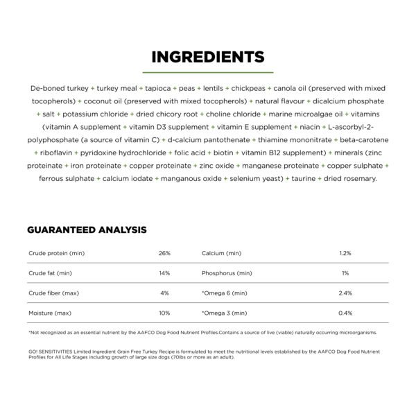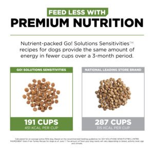 Looking for a dog food that supports food allergies and also tastes great? Go! Solutions Sensitivities Limited Ingredient Grain Free Turkey recipe for dogs is a delicious food made with premium quality turkey as the single-source animal ingredient. Using as few additional ingredients as possible, this recipe is free from common food allergens, making it a great option for sensitive dogs. Made by pet nutrition experts in Ontario, Canada with only premium ingredients, you will love the quality and your dog will love the taste.