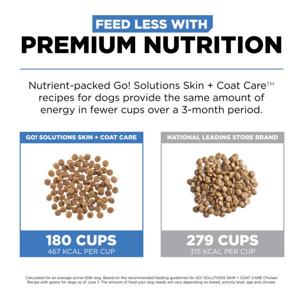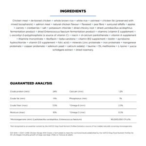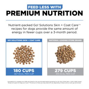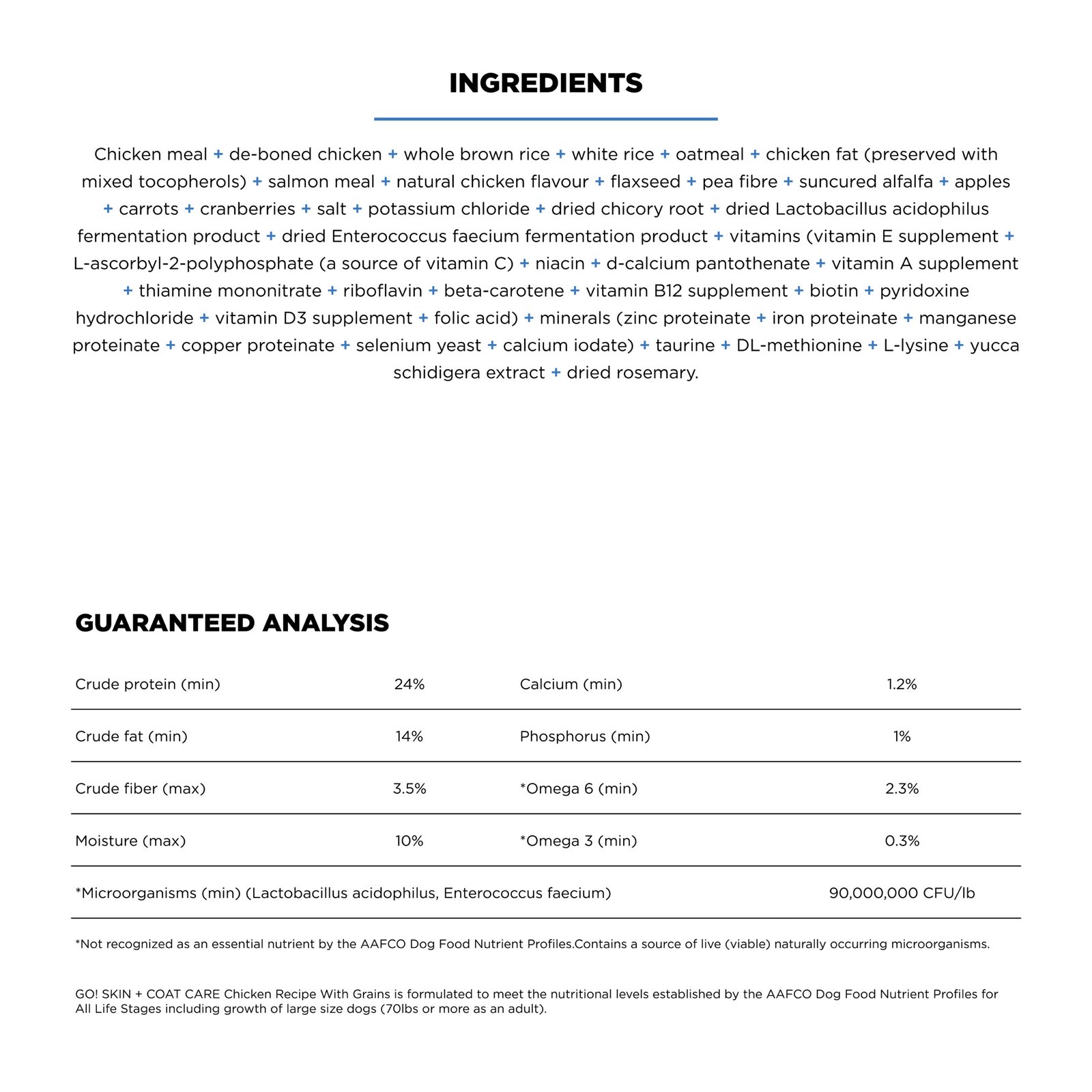 Go! Solutions Skin + Coat Care Chicken Recipe with Grains for dogs is made with love in Ontario, Canada. This premium dog food is packed with omega fatty acids to keep your dog’s skin hydrated and their coat looking fabulous. Made with natural ingredients like premium-quality chicken, antioxidant-rich fruits + veggies, and whole grains for an energy boost, this complete & balanced recipe is free from by-product meals, artificial preservatives, flavours or colours, and wheat, corn, or soy.