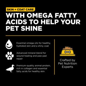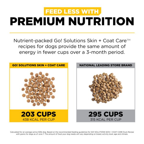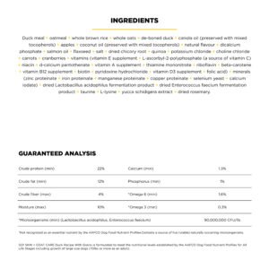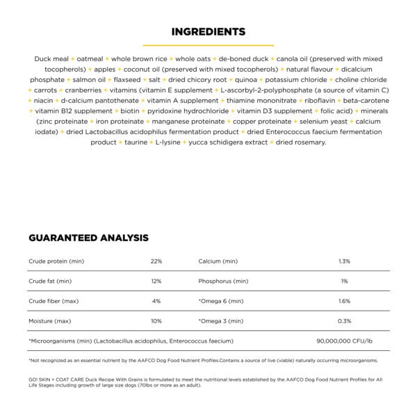 Go! Solutions Skin + Coat Care Duck Recipe with Grains for dogs is made with love in Ontario, Canada. This premium dog food is packed with omega fatty acids to keep your dog’s skin hydrated and their coat looking fabulous. Made with natural ingredients like premium-quality duck, antioxidant-rich fruits + veggies, and whole grains for an energy boost, this complete & balanced recipe is free from by-product meals, artificial preservatives, flavours or colours, and wheat, corn, or soy.