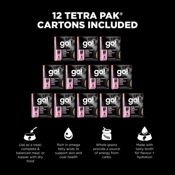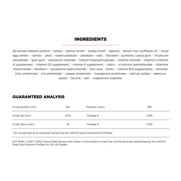 Your best pal deserves nothing but the best nutrition. That’s why Go! Solutions Skin + Coat Care Pollock Pâté Recipe with Grains for dogs is formulated by pet nutrition experts in Ontario, Canada. Crafted with wild Alaskan pollock, whole ground flaxseed, and sunflower oil to support healthy skin and a shiny coat, this recipe offers premium quality, complete & balanced nutrition for dogs of all ages.