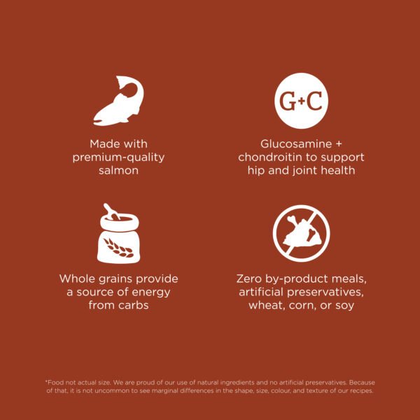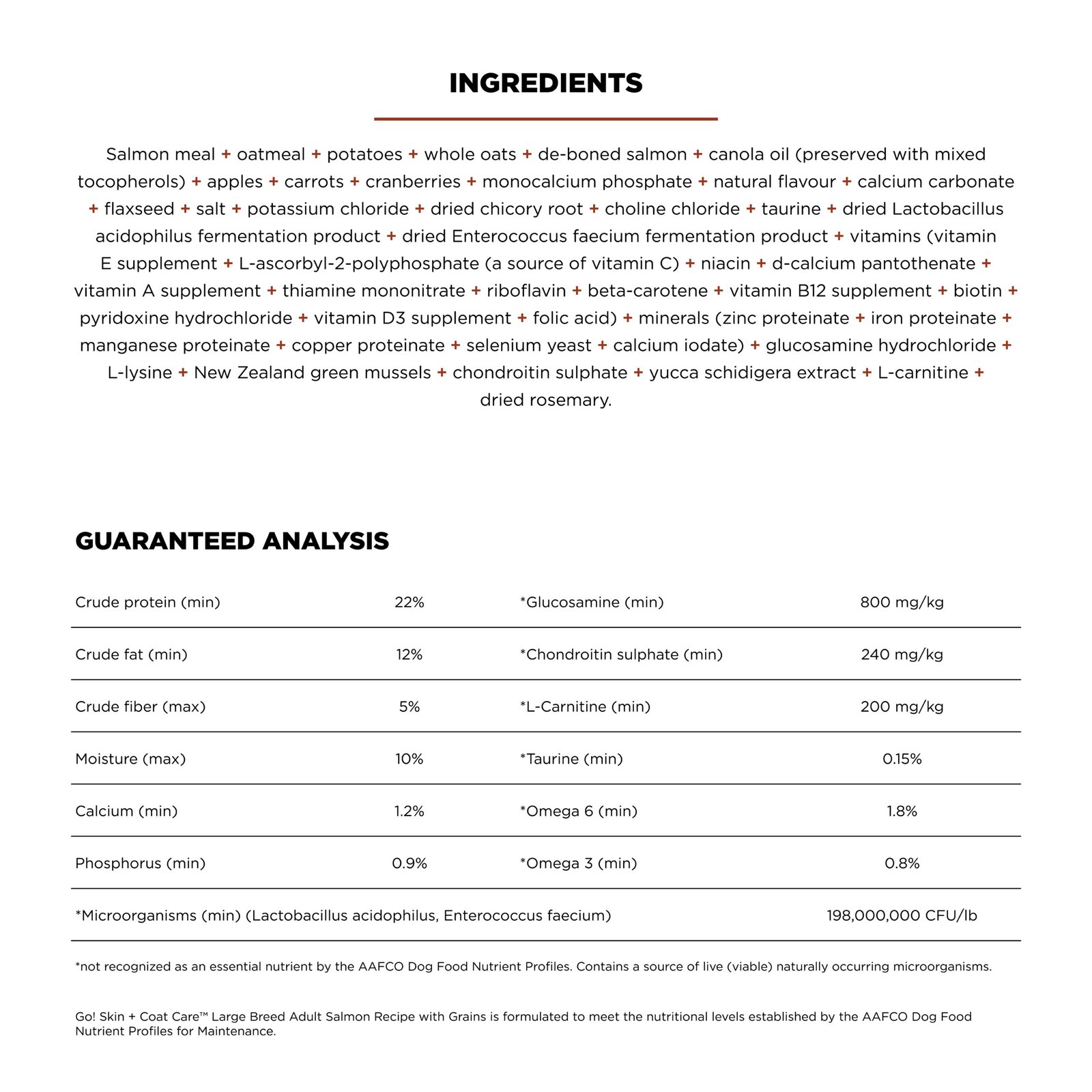 Go! Solutions Skin + Coat Care Salmon Recipe with Grains for dogs is made with love in Ontario, Canada. This premium dog food is packed with omega fatty acids to keep your dog’s skin hydrated and their coat looking fabulous. Made with natural ingredients like premium-quality salmon, antioxidant-rich fruits + veggies, and whole grains for an energy boost, this complete & balanced recipe is free from by-product meals, artificial preservatives, flavours or colours, and wheat, corn, or soy.