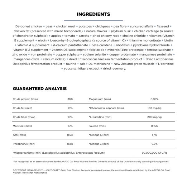 Looking for a delicious way to help your cat maintain a healthy weight and strong joints? Look no further than Go! Weight Management + Joint Care Grain Free Chicken Recipe for Adult Cats. This recipe is packed with lean protein, healthy fats, and ingredients that support a healthy weight and mobile joints, to help your furry friend feel great for years to come.