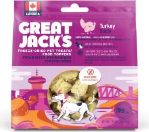 Great Jack’s Freeze-Dried Raw Dog TreatsĀ is a cubed freeze-dried treat bursting with flavour. Using turkey as the main ingredient each small batch then goes through a low temp, freeze-drying process that locks in the flavour and natural nutrients inside. Each cube contains under four calories and is excellent as a treat during training, hiding in an interactive puzzle toy for crumbling and sprinkling onto your dog’s food as a food topper.