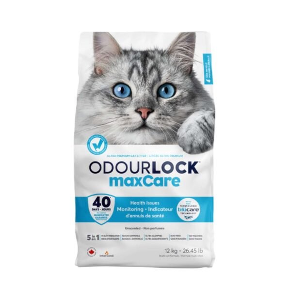 Intersand Odourlock maxCare Cat Litter is a 5-in-1 ultra premium clay cat litter. It is an extra-hard clumping, dust-free, non-tracking cat litter. In addition, this litter blocks ammonia and has Odourlock’s Blücare technology that detects the presence of blood and glucose in urine.