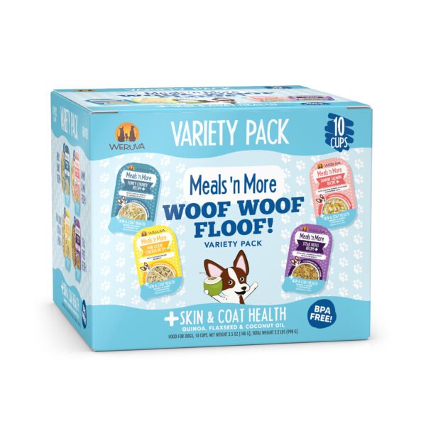 The Woof Woof Floof! 3.5 oz Variety Pack includes the following flavors: Funky Chunky Recipe Plus, Paw Lickin’ Chicken Recipe Plus, Jammin’ Salmon Recipe Plus and Steak Frites Recipe Plus