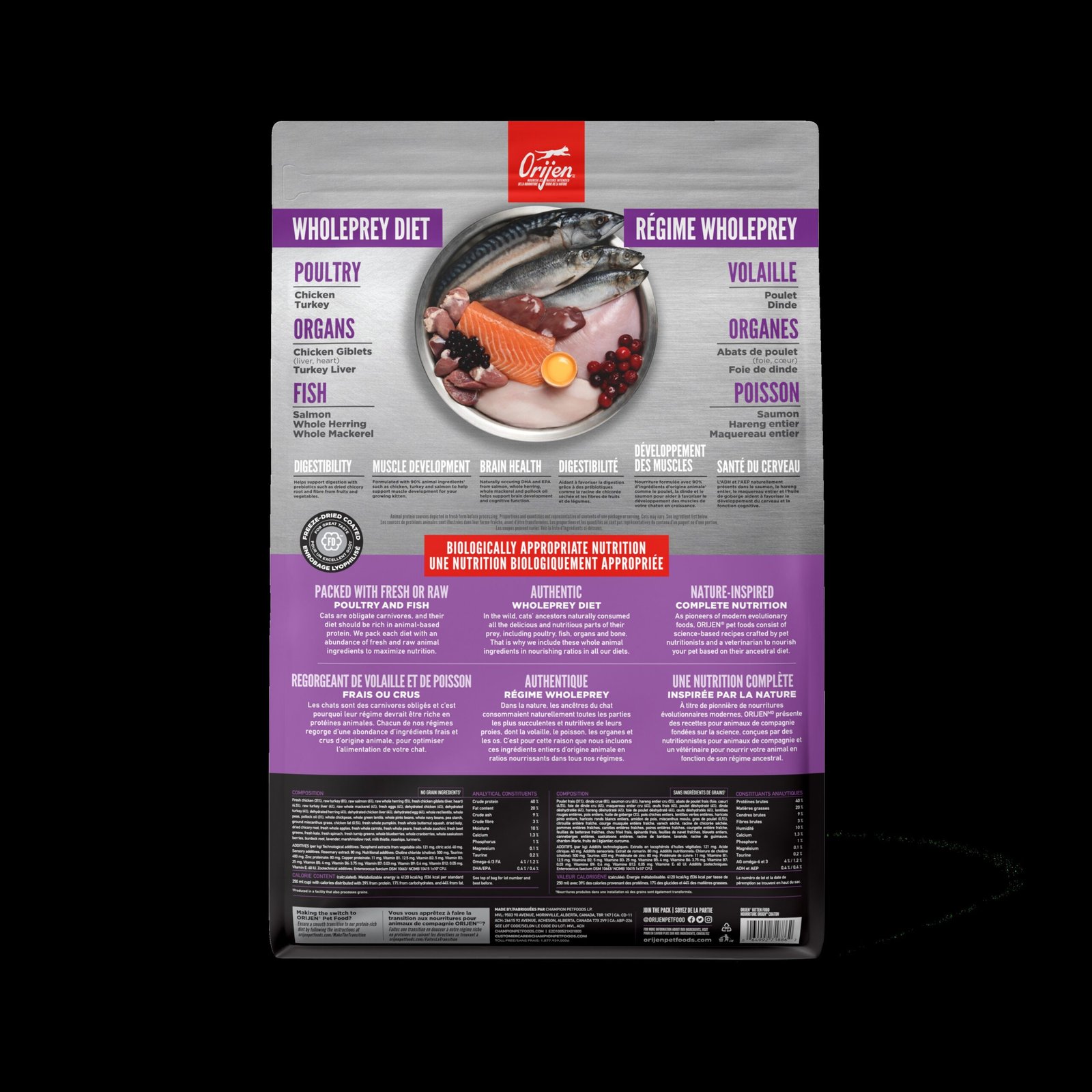 ORIJENĀ® Kitten diet is specially formulated to give your kitten the nutrients they need to grow healthy and strong. Packed with 90%* premium animal ingredients like chicken, turkey and salmon, it helps support muscle development in your growing kitten. It also contains 15 fresh or raw** ingredients, including WholePrey ingredients like muscle meat, organs and bone, the most succulent and nourishing parts of the prey. This diet helps support your kittenās brain development and cognitive function with naturally occurring DHA and EPA from salmon, whole mackerel and herring, and pollock oil. Your kitten will thrive when you feed them the fresh and raw animal protein they need. *Approximate and derived from the unprocessed state of the ingredients. **Our fresh ingredients use refrigeration as the sole method of preservation and our raw ingredients are frozen at their peak freshness.